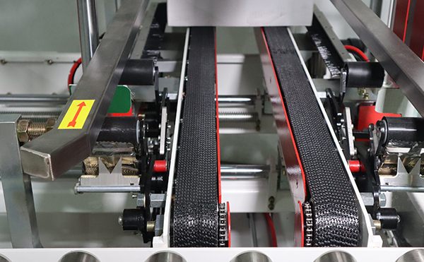 解决“封箱歪斜”问题:该全自动封箱机设备采用自动导向机构,能够自适应不同尺寸的纸箱。纸箱在输送线上运行时,会被自动校正至最佳位置,确保封箱过程中胶带平整、对称地贴合在箱体接缝处,彻底告别手工封箱常见的歪斜、起皱现象,封箱效果整洁美观。